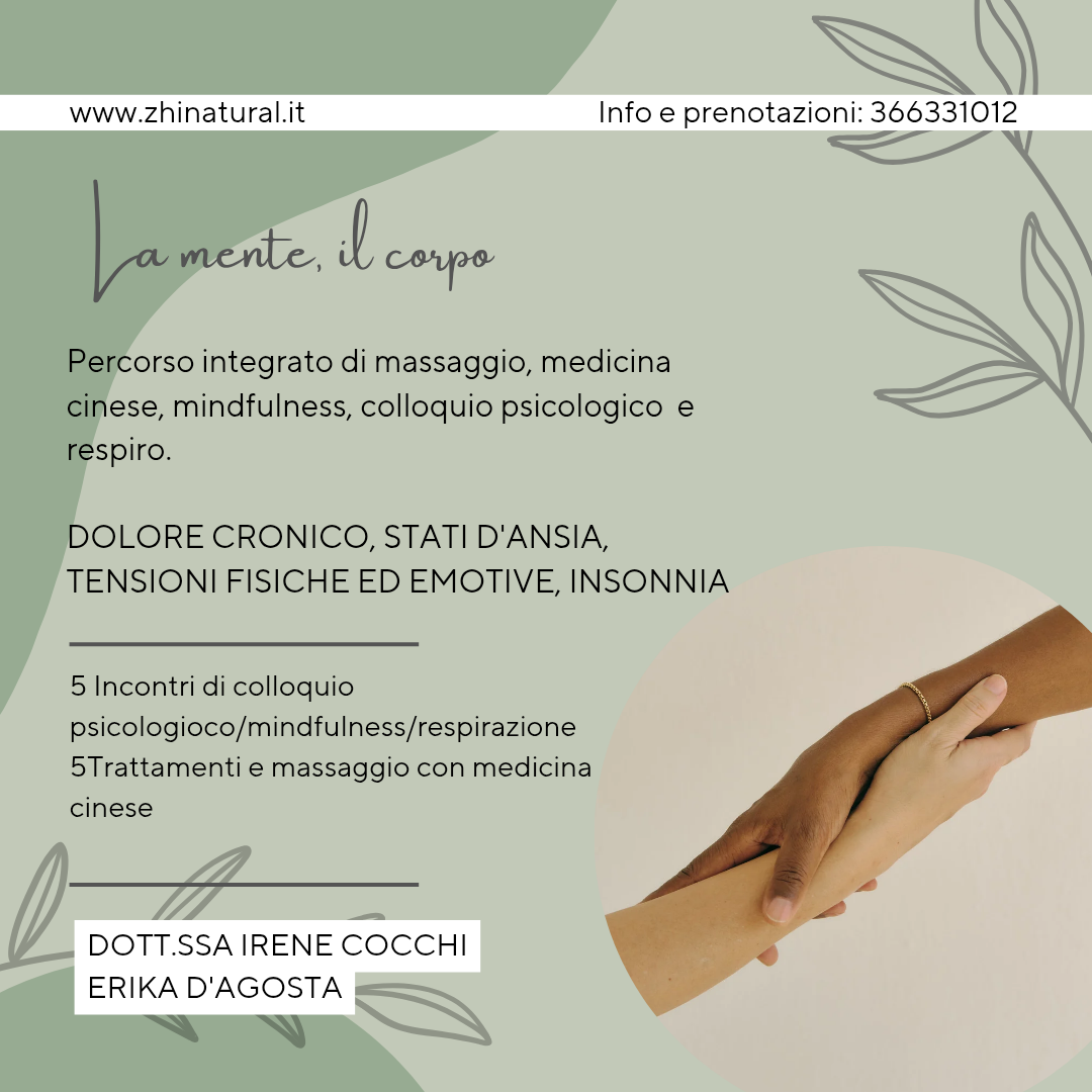 Abbiamo pensato perciò ad un percorso, una via d’ascolto per provare che ti a decifrare questi messaggi. L’obiettivo è creare una sinergia d’intervento unendo la sapienza millenaria della Medicina Tradizionale Cinese alla profondità del dialogo psicologico, creando una sinergia unica per affrontare il tuo dolore alla radice.